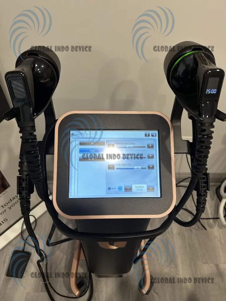 The system integrates Radiofrequency (RF) energy to heat deeper skin layers, stimulating collagen production and enhancing skin firmness.